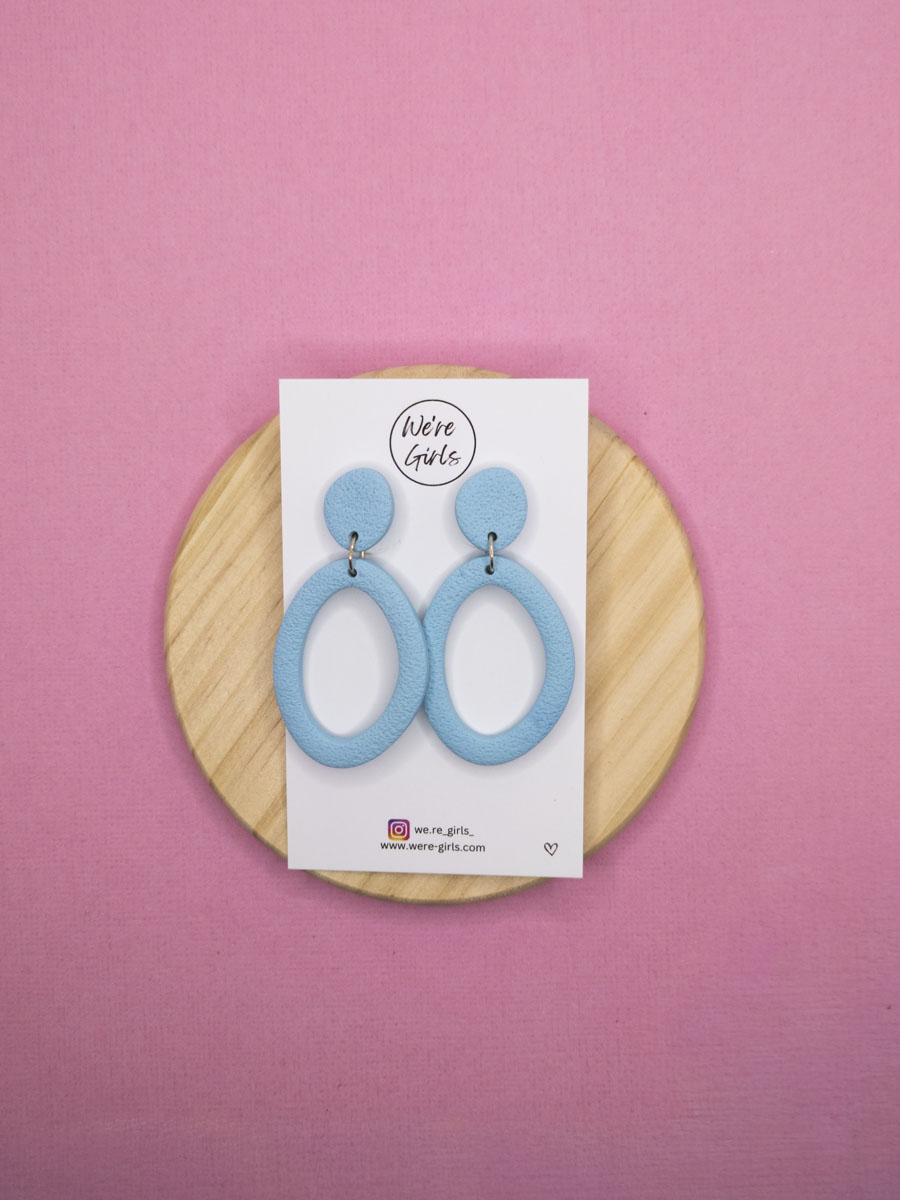 These dangle earrings, painted in the softest sky blue, drape playfully around your ears with an elegant oval shape that dances lightly with every turn, and their subtly textured surface adds a touch of warmth and whimsy that is sure to spark joy in your everyday adventures.